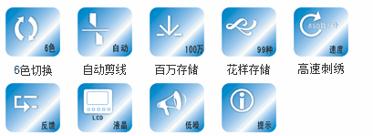 速度自动控制 刺绣过程中,根据针迹的特点,自动控制刺绣速度,卷绕绣最高可达500转/分钟,其他盘带绣可达600转/分钟